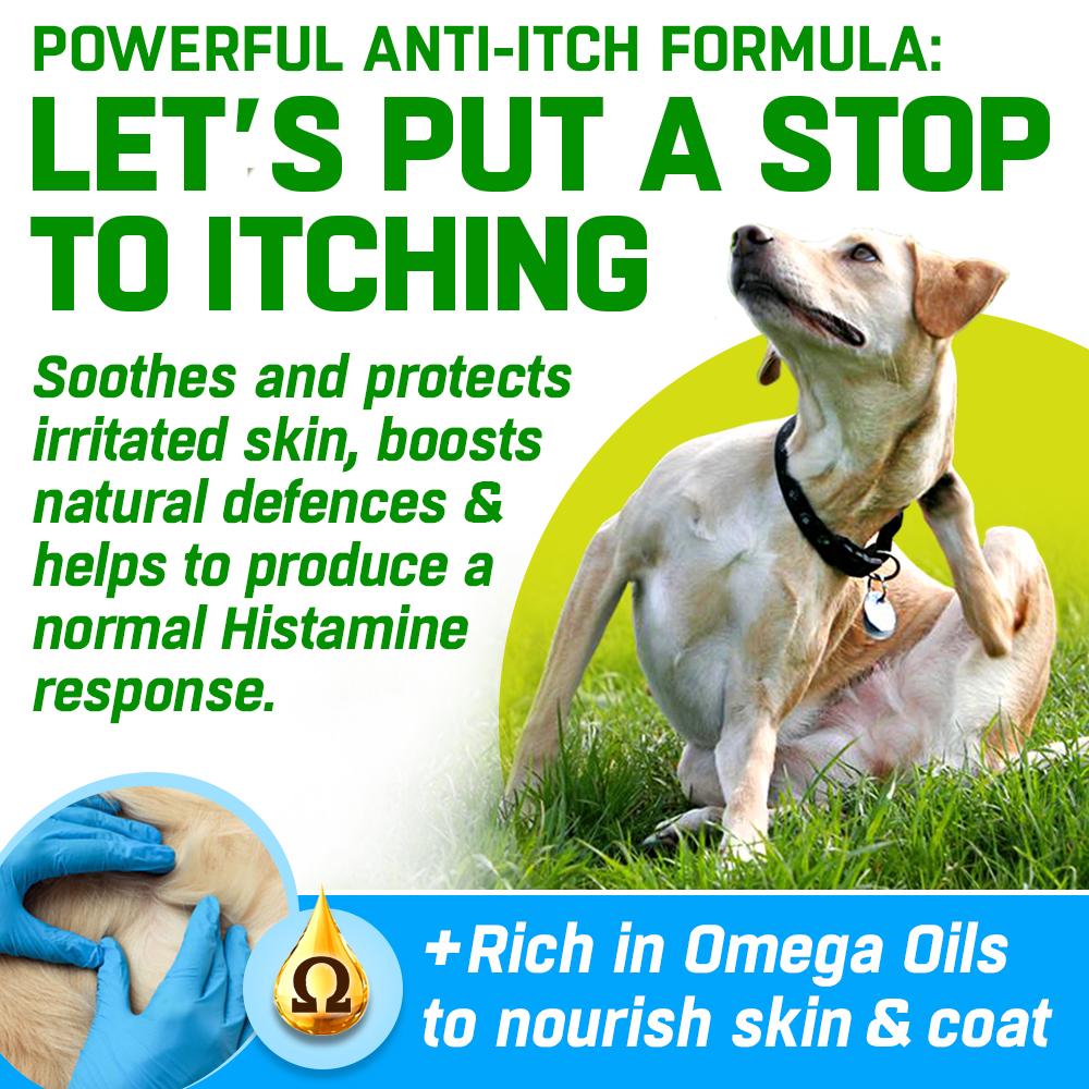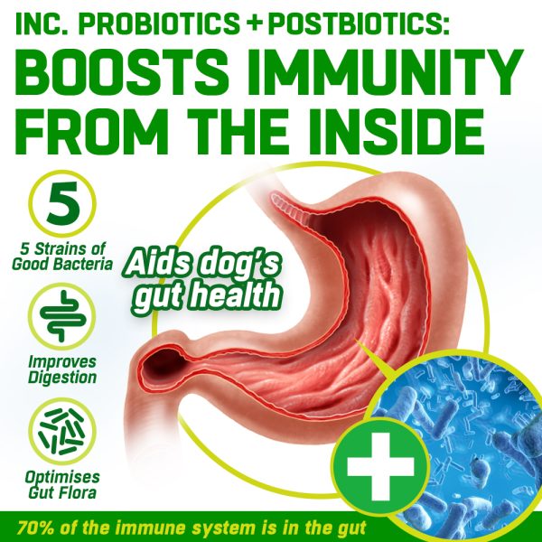 Vets and canine nutritionists know that strong immunity and long-term allergy resistance is built from the inside out. The naturally-derived active ingredients, probiotics & postbiotics in our itchy dog treats get to work fast: improving gut health, supporting immune functions & regulating histamine levels.