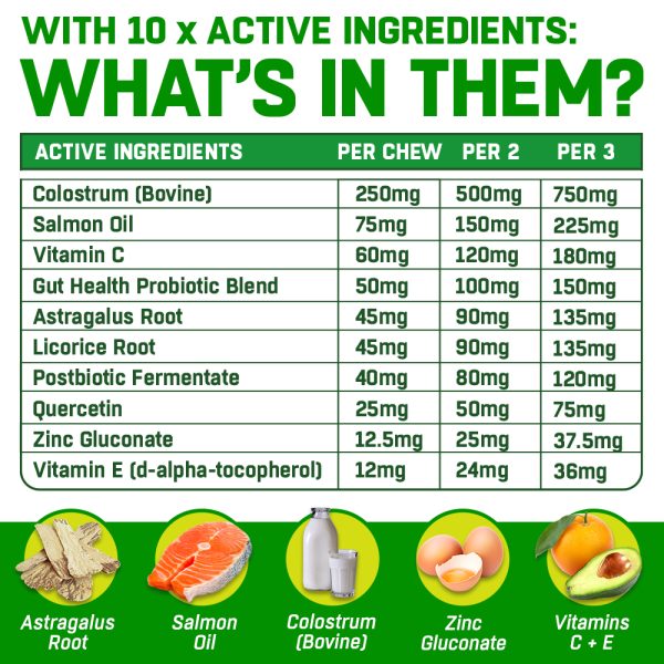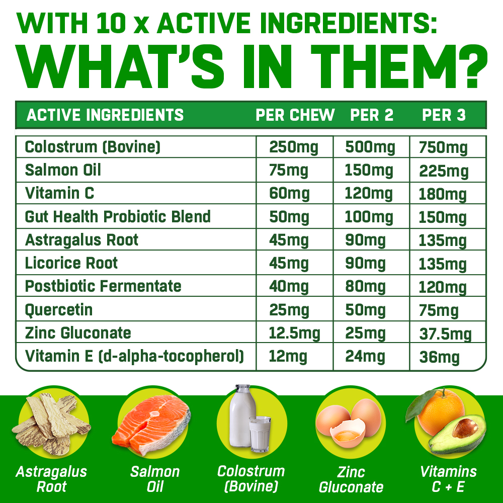 The chews contain – Bovine Colostrum, Salmon Oil, Vitamins C & E, Probiotic Blend, Postbiotics, Zinc, Quercetin, Astragalus root & Licorice root