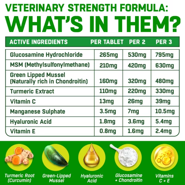 Great price as ‘branded’ products rise ! Been using a branded product thats getting expensive and currently scarce ! This product contains the essential elements at good levels, so will give it a try. Dog likes them ! Vet recommended a joint supplement after our dog had a cruciate ligament injury and had TPLO surgery.