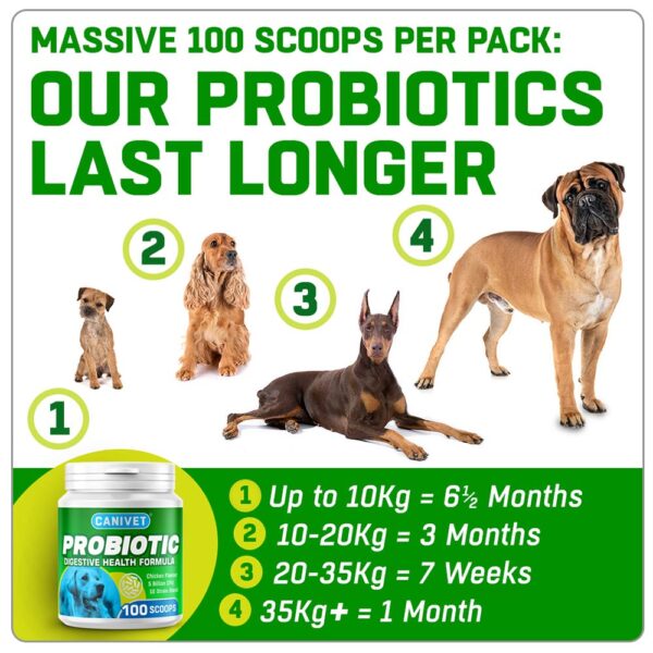 Sorts Issues Out Fast! Easy to use and measure, we use this like some of the more expensive, branded, pro-biotics that are on the market. Having dogs with sensitive stomachs, this is brilliant for either clearing up issues as soon as they occur or for if we are forced to change their feed. The pot says see the difference in 6 weeks, well we see the difference in 12 – 24 hours (after just one dose). We use it for 5 days in the event of issues to ensure that they are fully resolved before discontinuing and when changing feeds we use it for the entire change over period (around 7 days). This stuff is brilliant there is enough for 10 full treatments for our two dogs.