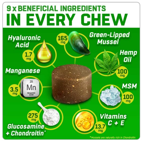 | Composition: Chicken Meal, Glucosamine Hydrochloride (Crustaceans), Hemp Seed Meal, Rice Flour, Green Lipped Mussel (Molluscs), Chicken Liver Powder, Coconut Glycerin, Sunflower Lecithin, Hemp Oil, MSM (Methylsulfonylmethane), (Molluscs), Brewers Yeast, Molasses, Vitamin C, Rosemary Extract, Vitamin E, Natural Preservative (Sorbic Acid) > For allergens see above in bold |