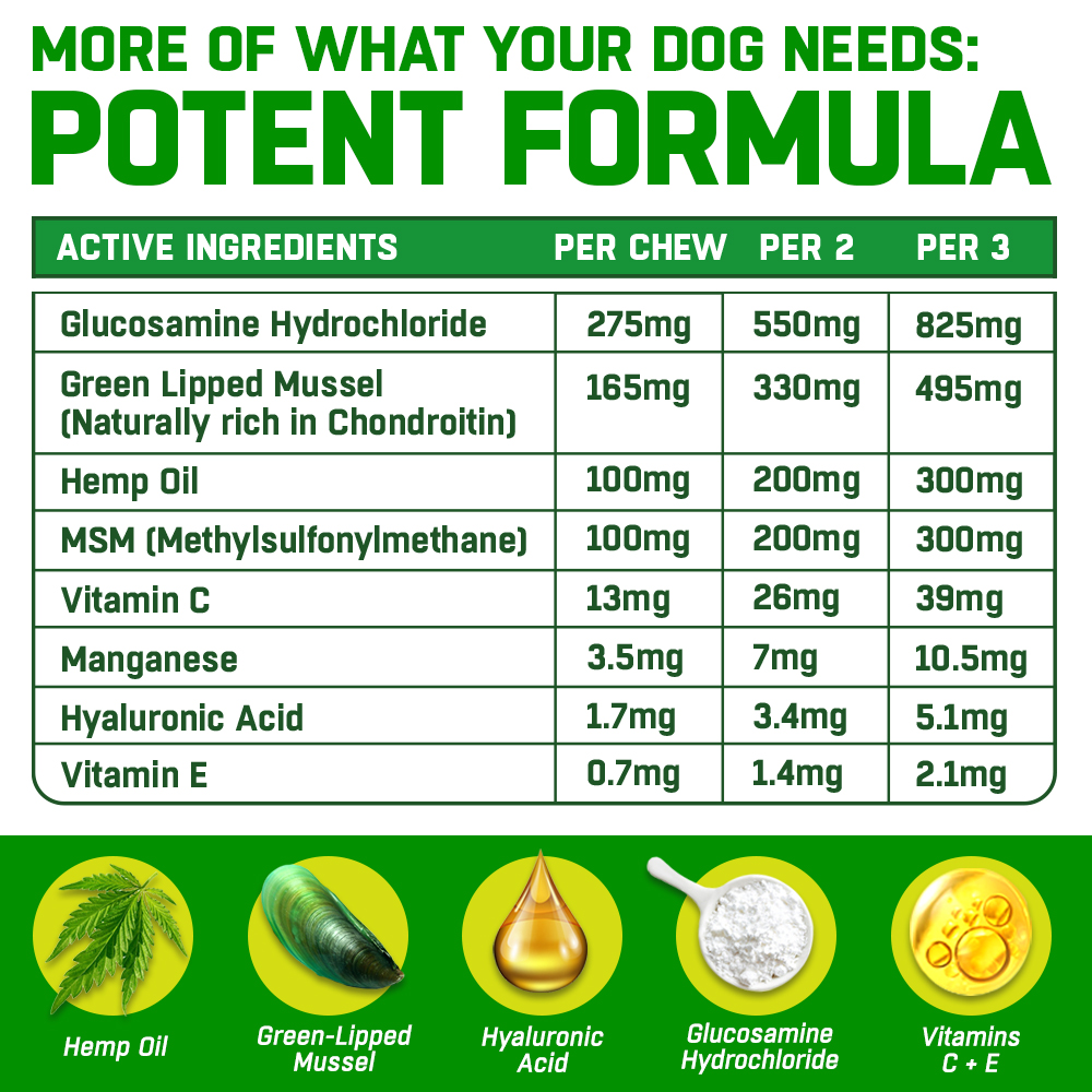 Amazing. My chihuahua was holding up her back leg every now and then so thought I’d try these, not only is she doing great she also eats them as a treat and she is the fussiest dog ever! Amazing such a good find I’m going to continue giving both my girls one daily.