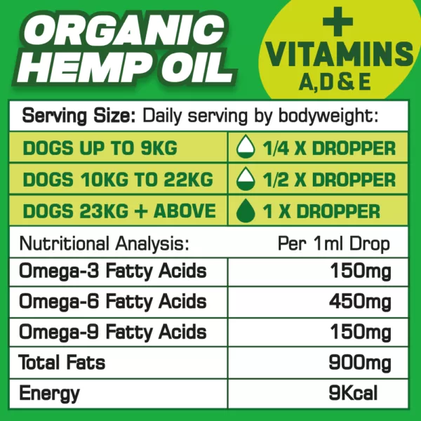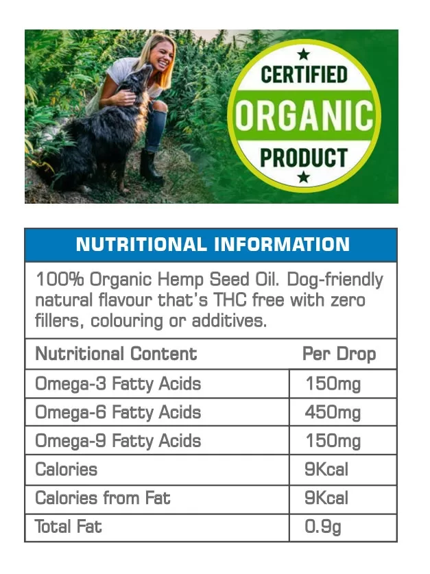 By using a hemp oil dogs can not only feel calmer, they’ll be feeling healthier too! Hemp Oil is a potent natural source of Omega 3-6-9 fatty acids which dogs need to obtain from what they eat, as their bodies cannot manufacture them. These ‘good fats’ bring many great benefits including supporting brain and heart health, improving joint mobility and ensuring strong, healthy skin and coats.